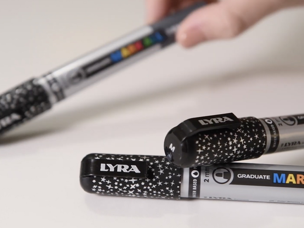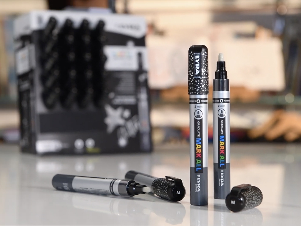 Ar Lyra Graduate Mark All krāsu flomāsteriem vari viegli dekorēt jebkuru virsmu — audumu, papīru, kartonu, koku, metālu un gandrīz jebkuru citu materiālu. Tie ir ideāli piemēroti zīmēšanai, krāsošanai, dekorēšanai, marķēšanai, rakstīšanai, kaligrāfijai un daudzām citām tehnikām.