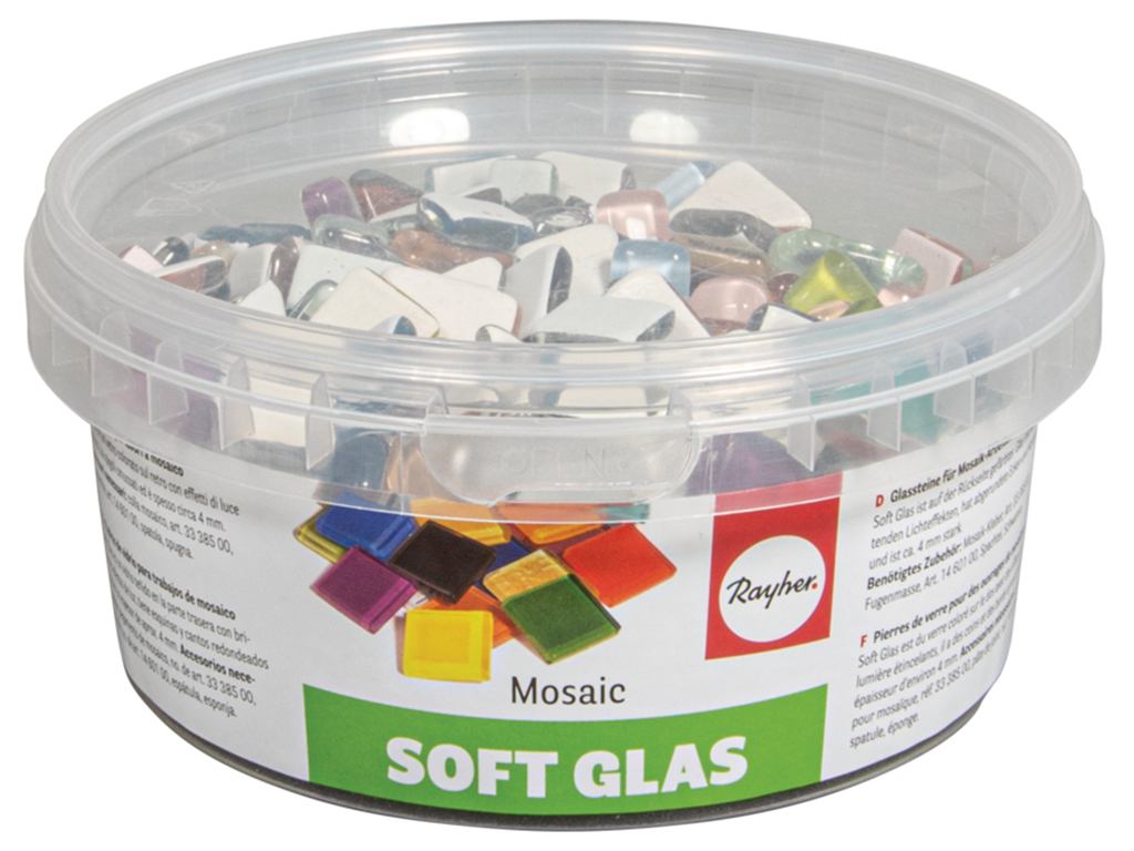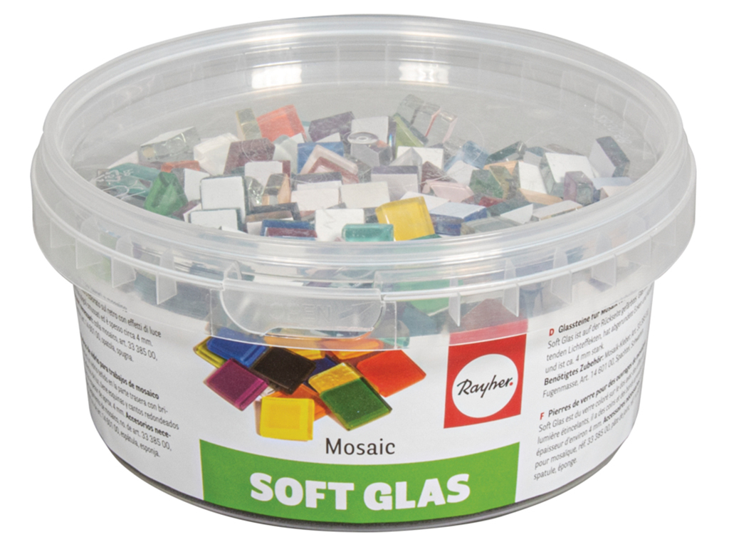 Rayher Soft Glas mozaīkas akmeņi ir krāsots stikls ar izgaismotas gaismas efektiem otrā pusē. Akmeņiem ir noapaļoti stūri un malas, un tie ir apmēram 4mm biezi. Tie ir izturīgi pret laika apstākļiem/ UV starojumu, kā arī salu, tāpēc to bez problēmām var izmantot ārpus telpām, līdz ar to tos var pakļaut ziemas apstākļu ietekmei. Spilgts, krāsains sortiments nodrošina skaistākus darb rezultātus. Rotājiet dārza galdus, laternas vai koka paplātes ar spilgtiem mozaīkas rakstiem – iespējas ir neierobežotas!